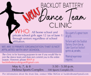 If you are a home school or private school girl age 12 through senior, regardless of your cover school, you are invited to come to the Backlot Battery Color Guard Clinic May 12, 14, and 16 or our new Dance Team clinic May 6, 7, and 8, both from 3:30-5:30 p.m. at the Helena Sports Complex (100 Sports Complex Drive). Come to one or come to both and see which one you like best.