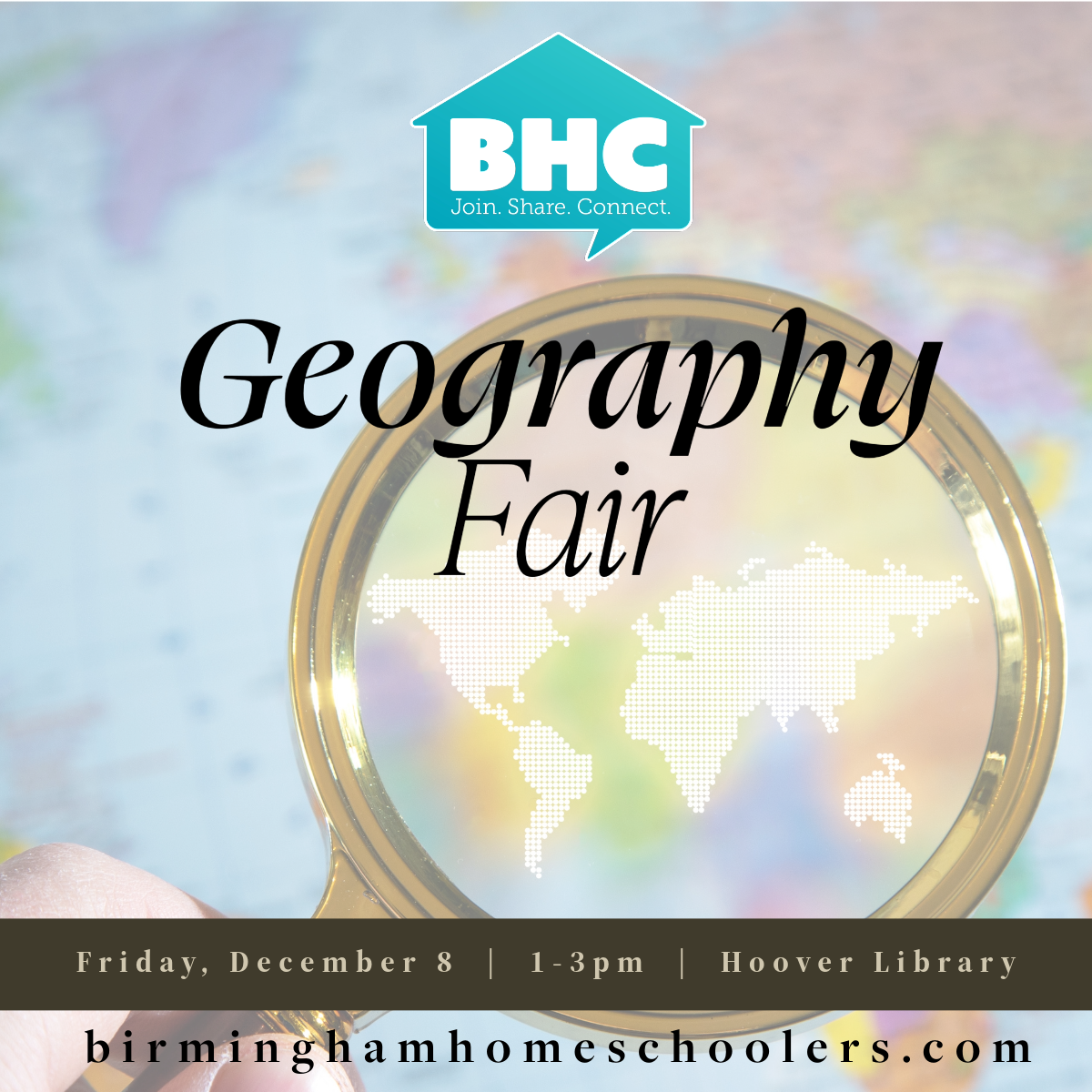 Visit the BHC website to register your student's participation by December 6th! More info at https://birminghamhomeschoolers.com/event/geography-fair/