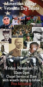 The American Village will hold a public commemoration of Veterans Day on Friday, November 10. A Service of Thanksgiving will be held in the Colonial Chapel at 11:00 a.m., followed by a wreath laying at the National Veterans Shrine. Family-friendly activities will be offered from 10am to 3pm. Admission is free.